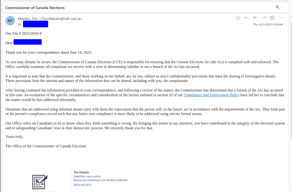 We submitted a violation to Election Canada and their conclusion, which we received today is that there was a breach: