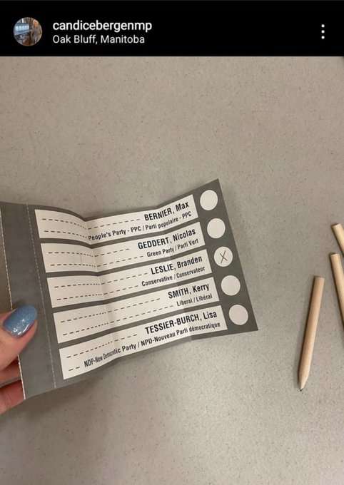 Candice Bergen posted a picture of her voting for the Conservative Party of Canada candidate Leslie “Let’s Go” Branden. I always thought when Branden posted that on his launch he was mocking the electorate, but only he knows if that is true.